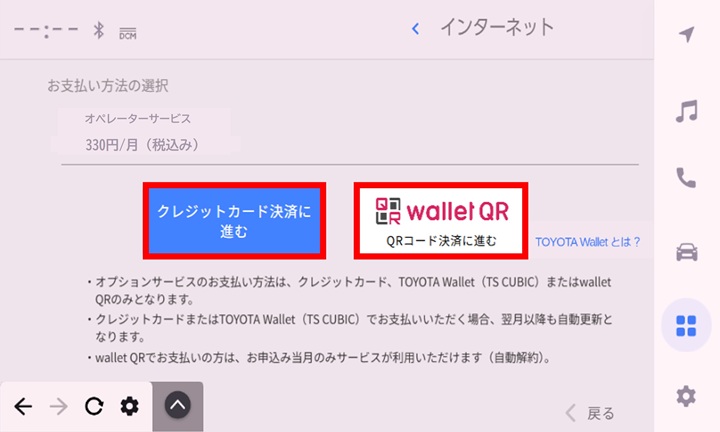 - ナビからオプションサービスを申し込みする場合は、登録可能な支払方法はクレジットカードのみです。