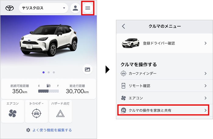 スマホアプリ「My TOYOTA+」の「ハンバーガーアイコン「≡」」>「クルマの操作を家族と共有」>「共有してもらう(家族のクルマを一緒に使う)」から、オーナーのQRコードを読み取り、またはSMSで認証コードを受け取ってご利用ください。