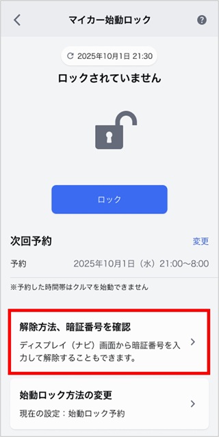 - 「解除方法、暗証番号を確認」をタップ