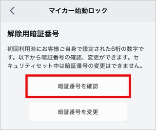 - 「暗証番号を確認」をタップし、スマートフォンで再認証をおこなうと、暗証番号が画面に表示されます