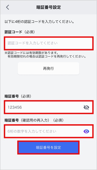 - サポートアドレスに届いた「認証コード」(数字4桁)、変更後の暗証番号(数字6桁)を入力し、「暗証番号を設定」をタップ