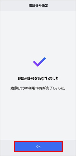- 「暗証番号を設定しました」画面が表示されたら「OK」をタップ